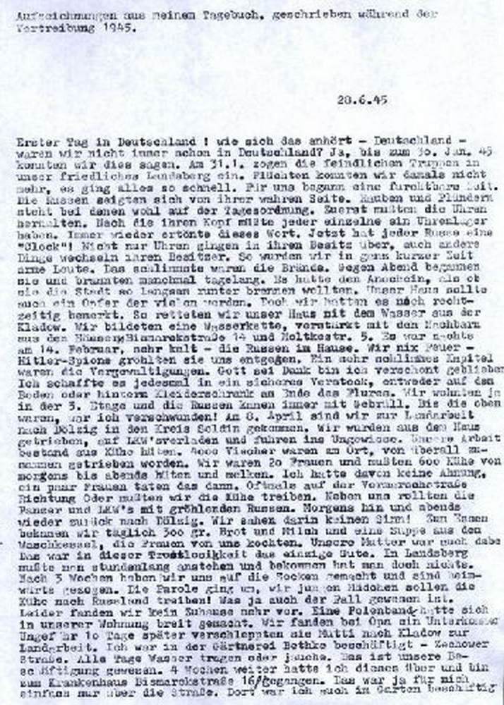 Hildegard B. (geb. Lutz), geb. am 13.07.1926, lebte in Landsberg/Warthe in der Bismarckstr. 15, flüchtete von hier im Juni 1945, lebte dann in einem Dorf im Havelland, ab 1951 im Ostteil Berlin, von wo sie 1954 nach Helmstedt und später nach Braunschweig verzog. Die Veröffentlichung erfolgt mit freundlicher Genehmigung des Archis der Stftung Haus Brandenburg.